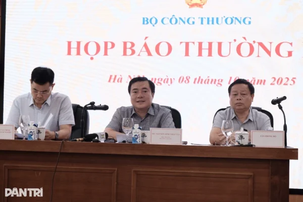 Thứ trưởng Công Thương Nguyễn Sinh Nhật Tân điều hành họp báo chiều 8/10 (Ảnh: Thanh Thương).